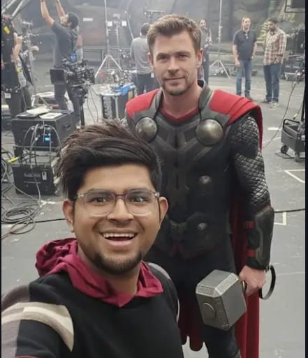 Create a realistic, high-fidelity (8K) image based on the attached reference photo. Maintain exact facial features, skin tone, bone structure, hairstyle, and expression with no alteration or face swapping. The attached person is taking a selfie with Chris Hemsworth on the behind-the-scenes set of a Thor movie shoot. Crew members are adjusting lighting and equipment, with visible cables and gear. Directors and managers stand behind discussing the next scene.