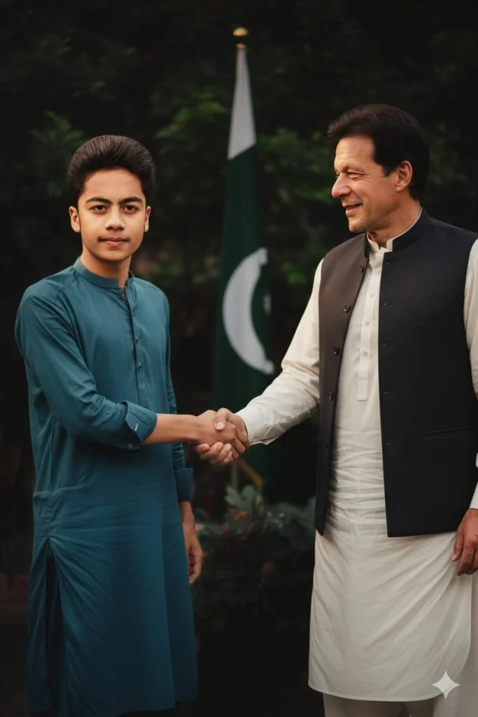 Edit this image to show me shaking hands with Imran Khan. Both of us should appear naturally positioned, with realistic body posture and expressions. Imran Khan is smiling warmly. Place a slightly visible Pakistan flag in the background, and keep the overall background dark with soft lighting focused on us. Do not change or modify my face in any way, keep it 100% original and natural. Ensure the handshake looks realistic, OUr faces clear and unchanged, and the edit ultra-realistic. Keep it original face 100% natural and original face.